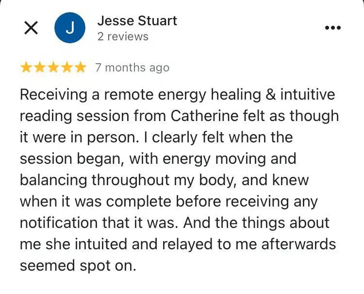 “Once it struck 8:00 pm, I felt a tingling sensation right away. Especially my spine a bit on above my head and once it hit 8:15 I felt a subtle vibration beneath me. When I felt these scenarios I knew Catherine was putting in the work! I also like to mention I felt as if things were being snipped off from my back. It made me feel lighter. Like, the things that arent my own (but carried them) have been lifted. She is definitely gifted!!! I’m glad that I took this chance to get a free session from her. Much appreciated for Catherine’s work and existence ❤!!! I almost cried when she said, “I am enough.” I felt it deeply in the soul. Thank you for this session! A gifted healer, I recommend her if anyone needs some bursts energy and healing!” – Lala